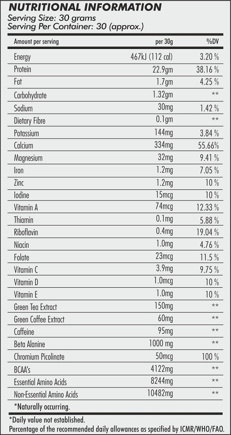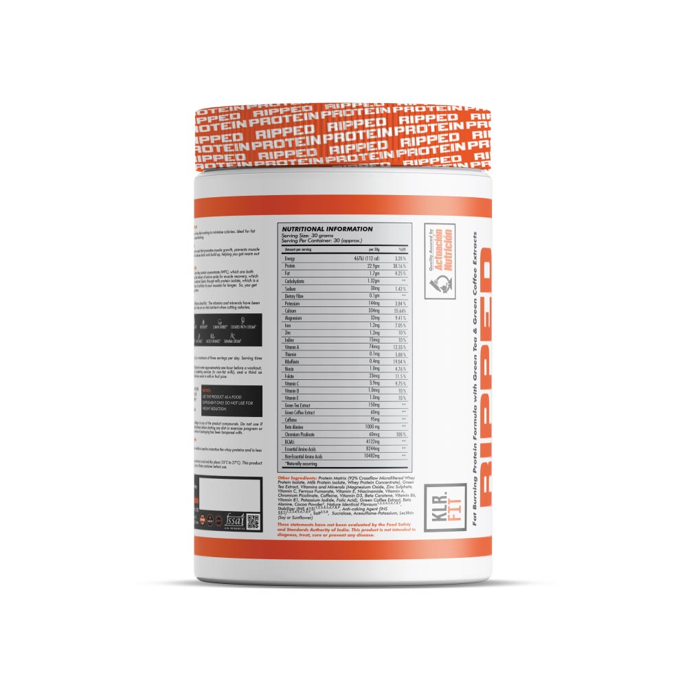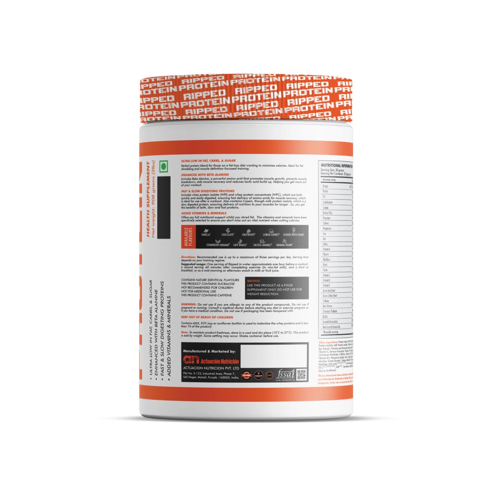 Ripped Protein is engineered using a proprietary triple-protein blend of Whey Protein Isolate, Whey Protein Concentrate and Milk Protein Isolate (Casein). The 3-protein blend contains all essential amino acids your body needs plus beneficial bio-active elements that support immune health, have anti-viral properties and more. All of this combined with a slow release peptide source makes for an ultimate fitness fuel. While the fast digesting proteins – Whey Isolate and Concentrate – quickly deliver essential amino acids needed by muscles for growth and recovery, the slow digesting Milk Protein Isolate keeps your muscles in a constant anabolic state, which is otherwise hard to maintain on a fat-loss diet.