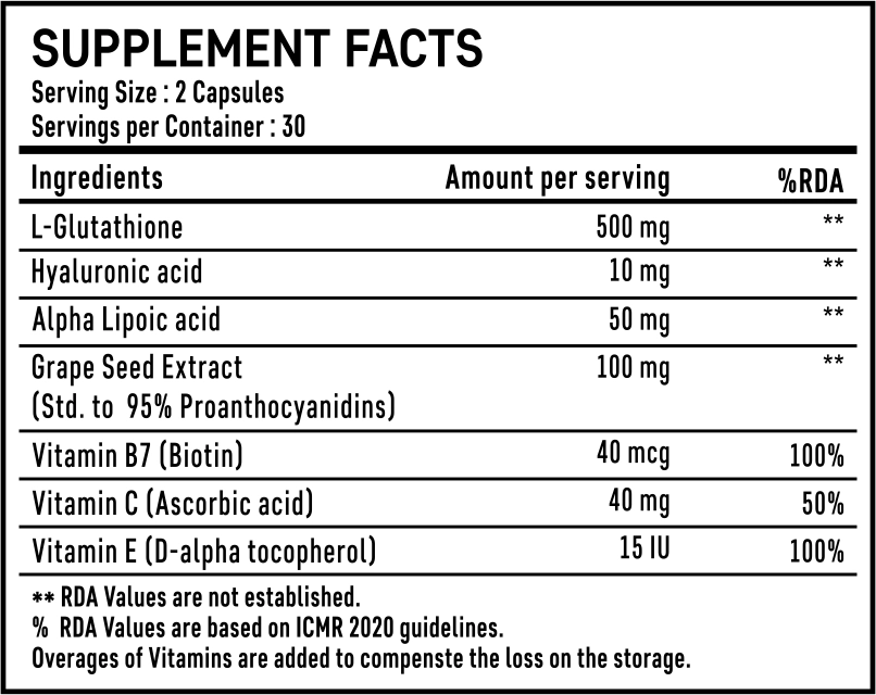 L-Glutathione: A powerful antioxidant, L-Glutathione plays a key role in reducing oxidative stress, supporting an even skin tone, and promoting a healthy glow.