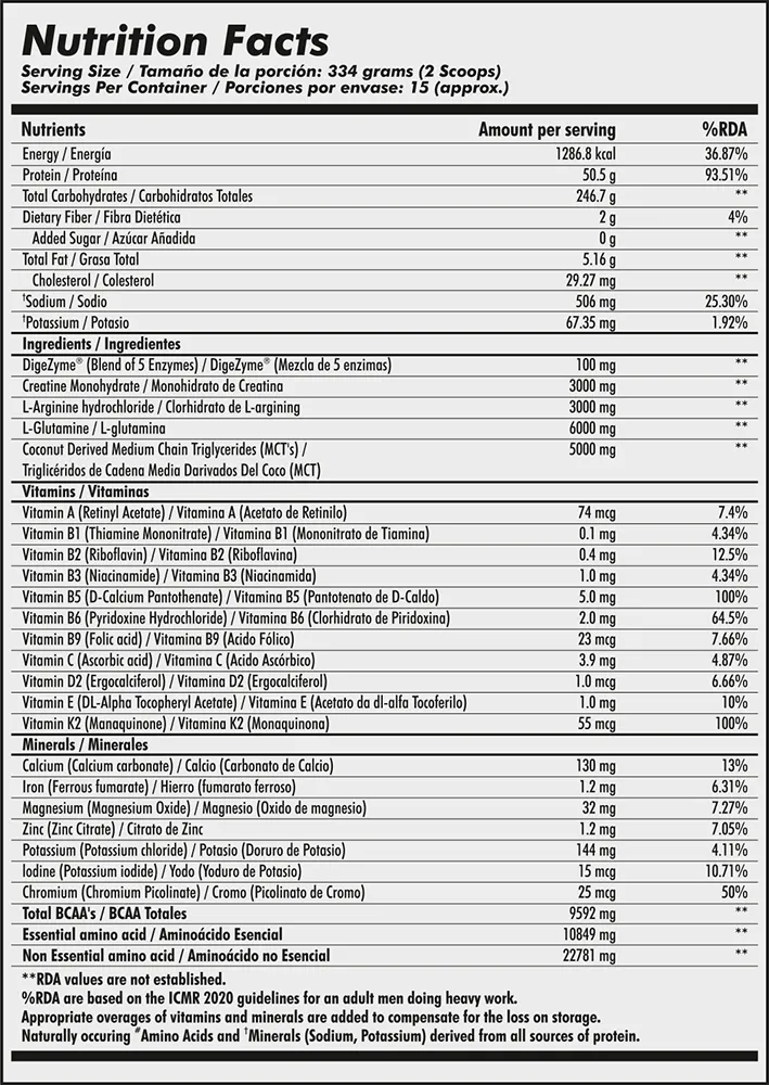 Warrior Mass XXXL 5Kg is the ultimate solution for those looking to bulk up and pack on serious muscle mass. Each serving delivers a whopping 1286.8 kcal of energy, 50.5g of high-quality protein, and 246.7g of complex carbohydrates, providing your body with the fuel it needs to support intense workouts and rapid muscle growth. With a carefully crafted blend of essential vitamins and minerals, including BCAAs and essential amino acids, this mass gainer ensures optimal nutrition for muscle recovery and repair.